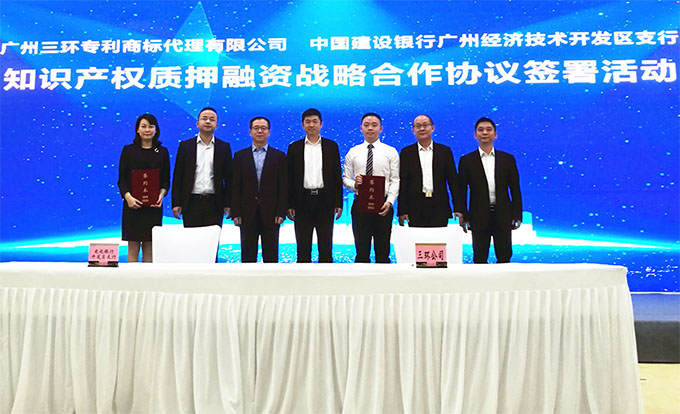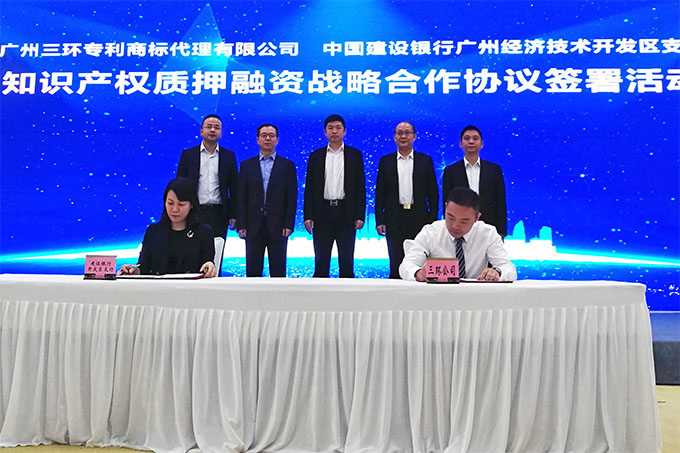 會上,在廣州市知識產權局協調合作處調研員柯杰兵、廣州開發(fā)區(qū)知識產權局局長劉石、三環(huán)總經理郝傳鑫等相關嘉賓的見證下,三環(huán)副總經理申屠嘉毅、中國建設銀行廣州經濟技術開發(fā)區(qū)支行副行長周穎梅分別代表雙方簽訂了知識產權質押融資戰(zhàn)略合作協議。